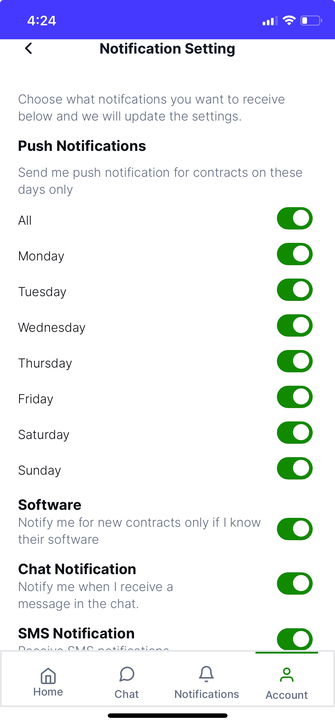 Personnalisez vos notifications pour la disponibilité en journée, le logiciel, la distance, le chat et les SMS.